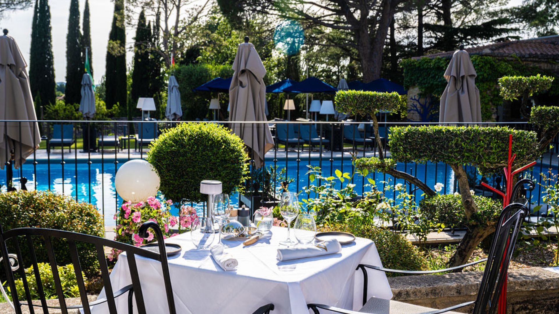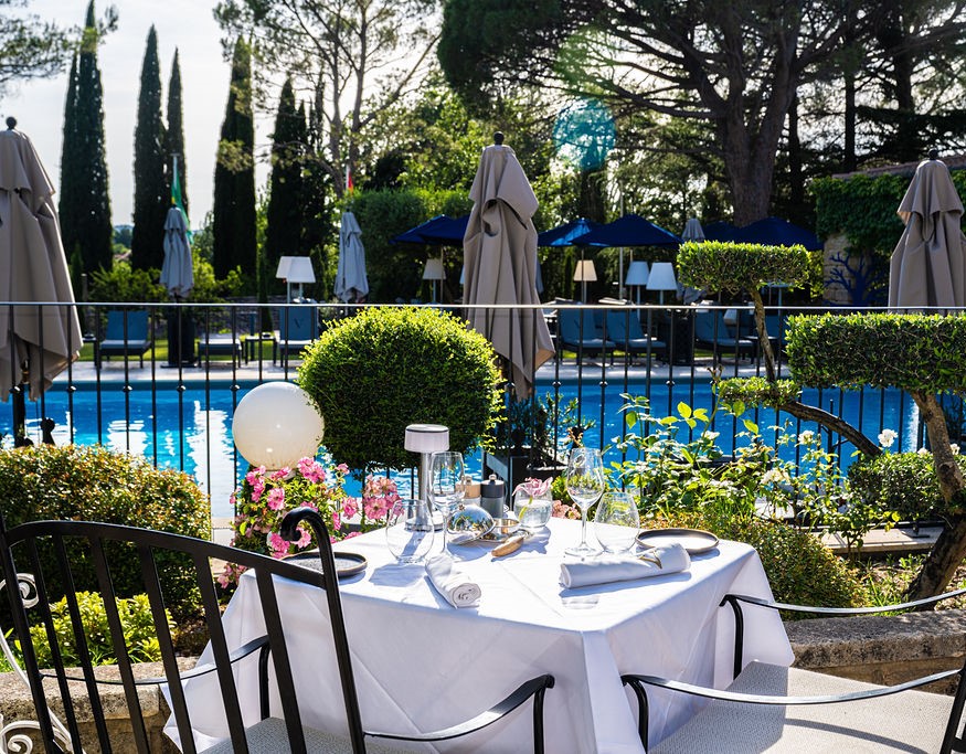Das Vallon de Valrugues Hotel Spa & Villas 5* bietet Ihnen die bezaubernde Kulisse der Alpilles für Ihr Essen. Sobald Sie Ihr Auto auf dem Hotelparkplatz abgestellt haben, können Sie sich entspannen und das bewaldete Anwesen, die schattige Terrasse am Pool oder die wohltuende Wärme des Restaurants genießen.